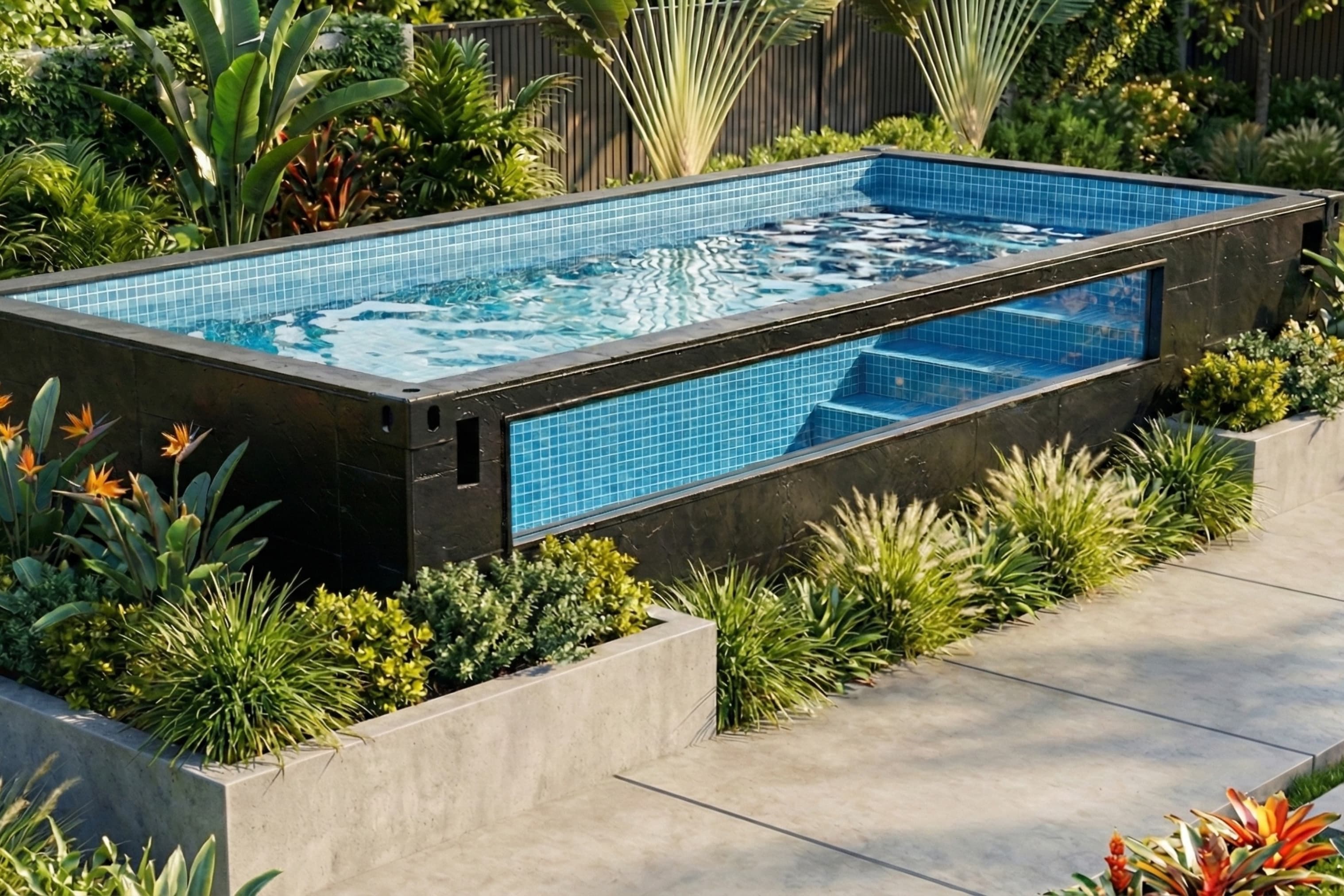 This modern shipping container pool is truly one-of-a-kind! It has a massive pool window giving it an ultra sleek and unique look. It also includes a pool deck with stairs and frosted glass modern railings. The pool is 20'L x 8'W x 4'6"H. The interior of the pool is completely tiled with small blue square tiles throughout and the exterior is finished with black faux tile. There is a storage compartment at the end of the pool (underneath the deck) which contains all the pool equipment; poop pump, filter and heater. The pool deck runs the full 8' width, has frosted glass railings and metal staircase.